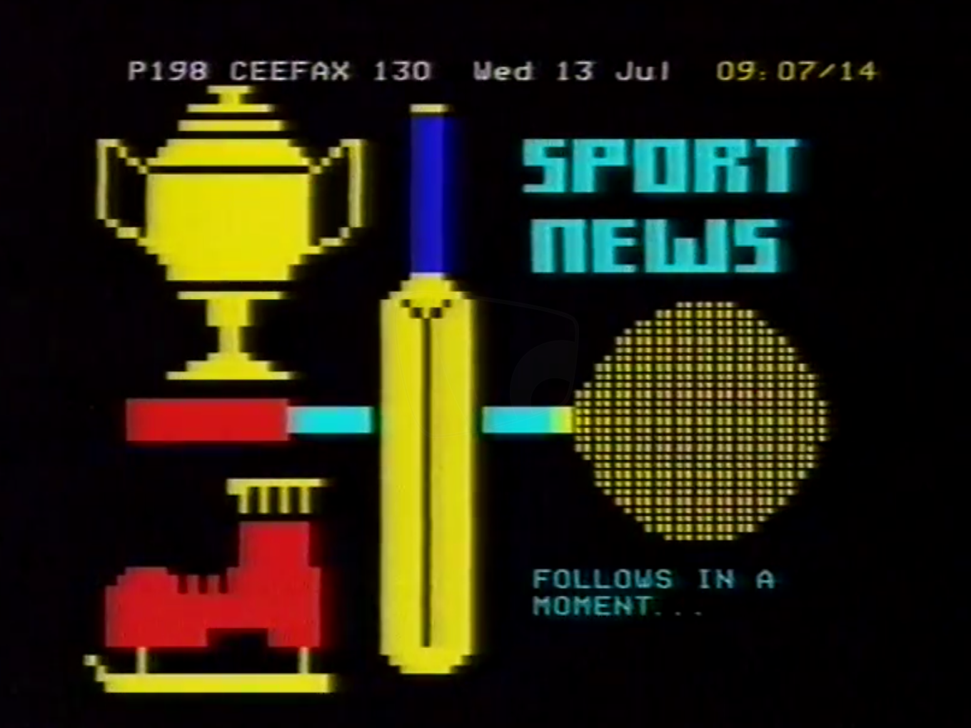 15th March 2020 by Editor SUPPLIED BY: YouTube Channel – Treffynnon19. COPYRIGHT: BBC. About Editor Previous Post:PICTURED: Ceefax In-Vision: sports news link page. An early version of the familiar graphic. The skating boot would later be removed, and the cup would be recoloured white. TX DATE: 13th July 1983.
